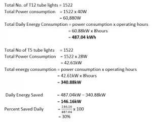 Energy Savings by replacing the T12 tube lights with higher efficient T5 tube lights is as follows: