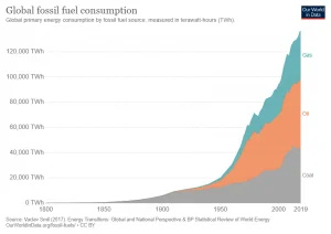 The demand for fossil fuels has exponentially increased to subsist constantly rising human productivity (See figure). However as previously explored this is not sustainable in the long-term and a simple solution to this is to reduce unnecessary demand for fossil fuels by implementing Energy Conservation. This can be defined as the process of achieving the same work output utilizing methods that require less energy.